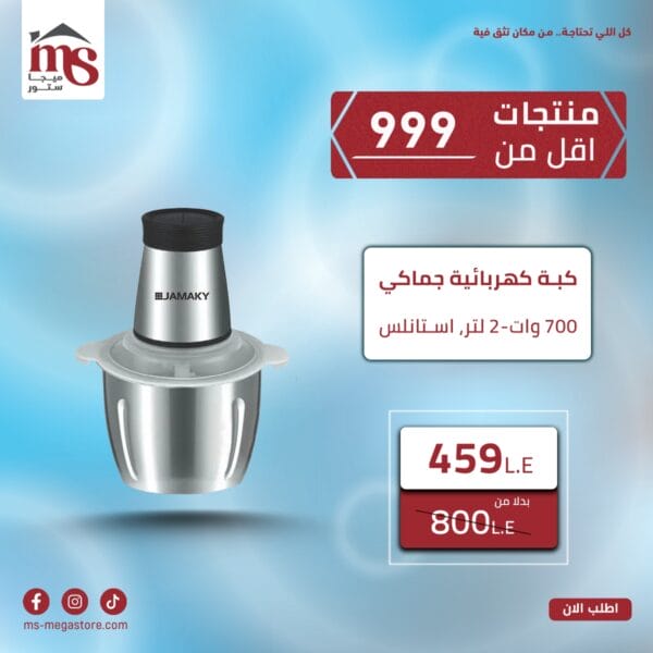 كبه كهربائية جماكى استانلس _ 700 وات _ 2 لتر السعر الأصلي هو: 800,00 EGP.السعر الحالي هو: 459,00 EGP.